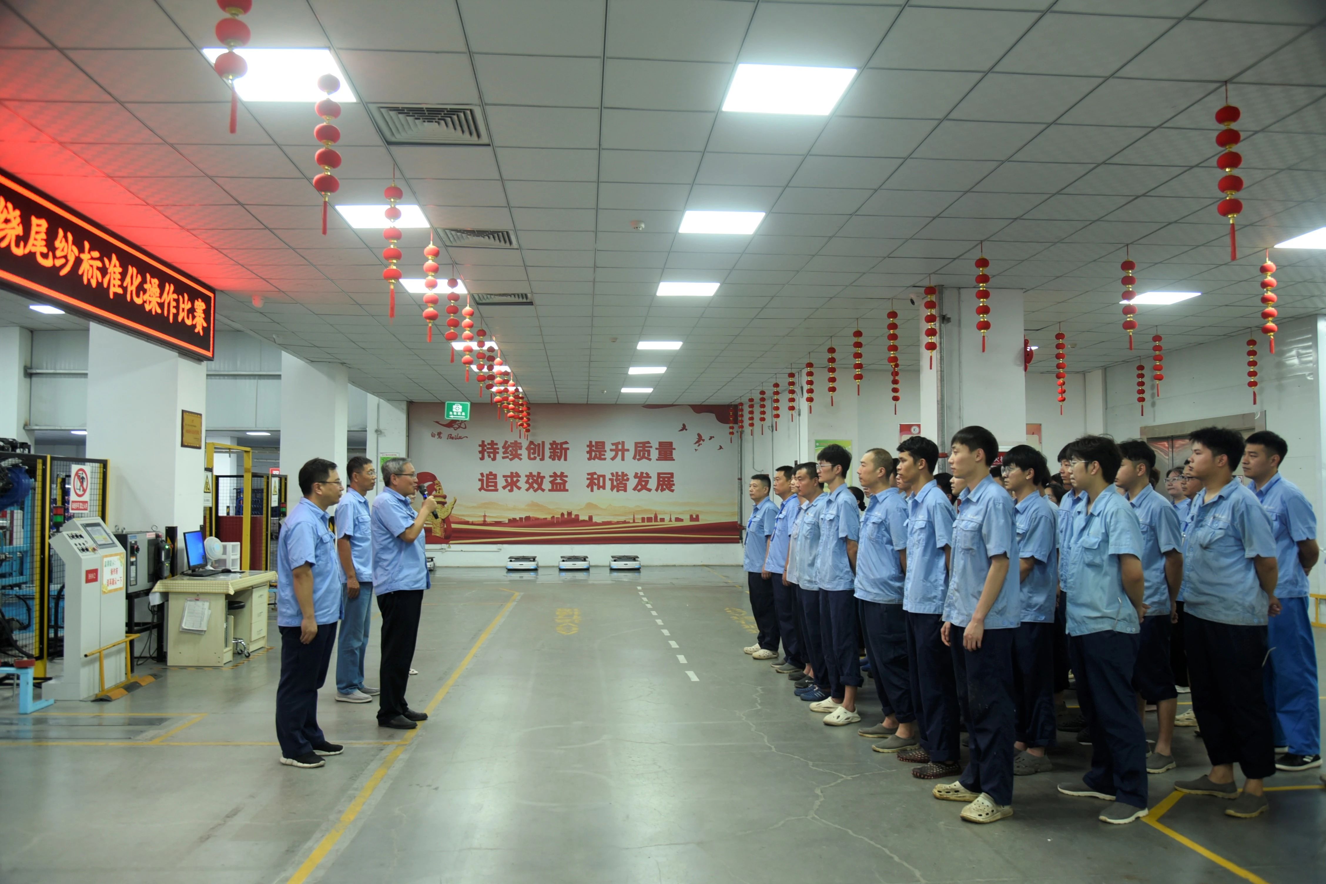 为提高青工尾纱卷绕技能和标准化操作水平,进一步促进生产效率和产品质量提升,7月30日,由公司团委主办、新区六长丝车间承办的“新区连续纺新工绕尾纱操作比赛”在新区六长丝车间成功举办。公司副总经理姚永鑫、总经理助理刘赤乾莅临比赛现场观赛。